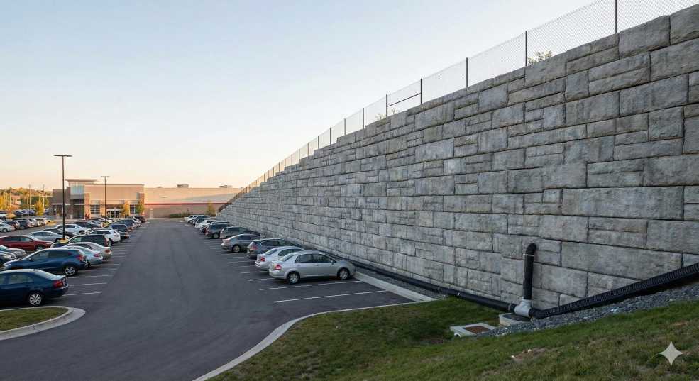 Yes — we build large structural retaining walls for developments, parking lots, industrial zones, and commercial landscaping.
